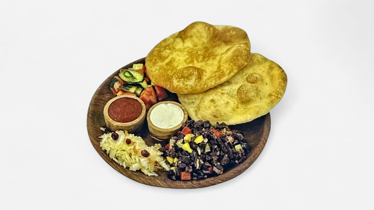 Нан бауырдак из говяжьего мяса, бульон, фри, вареный курт, перчик, соус