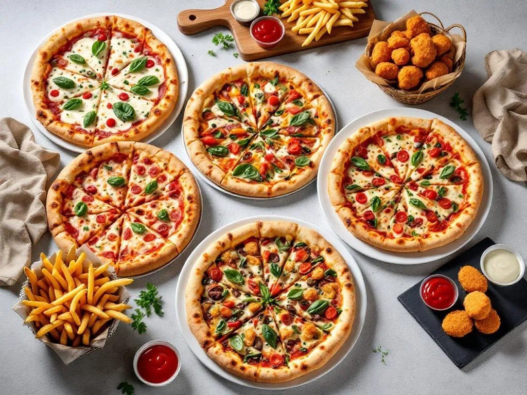 Пицца Маргарита (2 шт., 30 см), пицца Пепперони (2 шт., 30 см), пицца 4 сыра (30 см), картофель фри (3 порции), наггетсы (2 порции), Pepsi (2 шт., 1 л), кетчуп (150 г), сырный соус (150 г)
