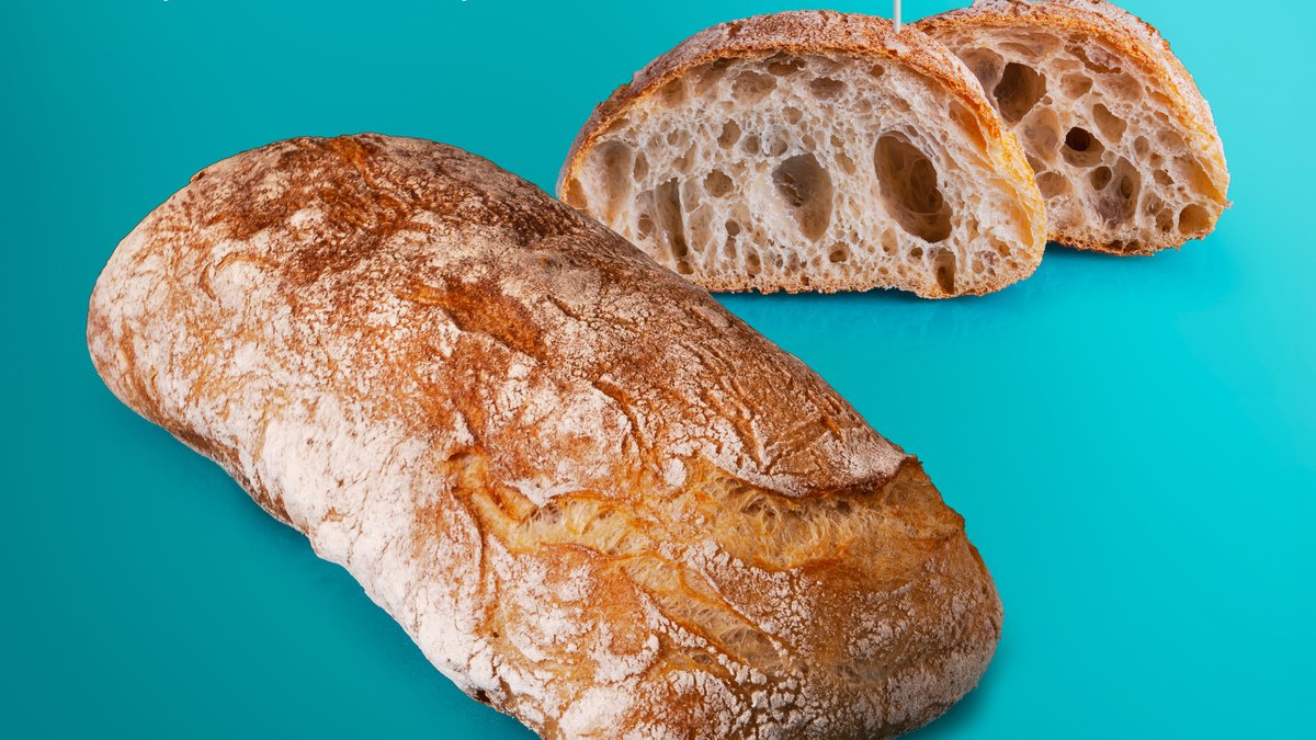 Оливковое масло, мука высшего сорта, дрожжи йодированные, соль, смесь композитная Чиабатта. Чиабатта с итальянского - Тапок. Национальный итальянский хлеб ручной работы, это нежное тесто нельзя пускать на поточную линию. Оливковое масло придает особый аромат и вкус этой булке. Чиабатта всегда произвольной формы, с крупными порами и приятным хрустом - в этом и заключается его уникальность