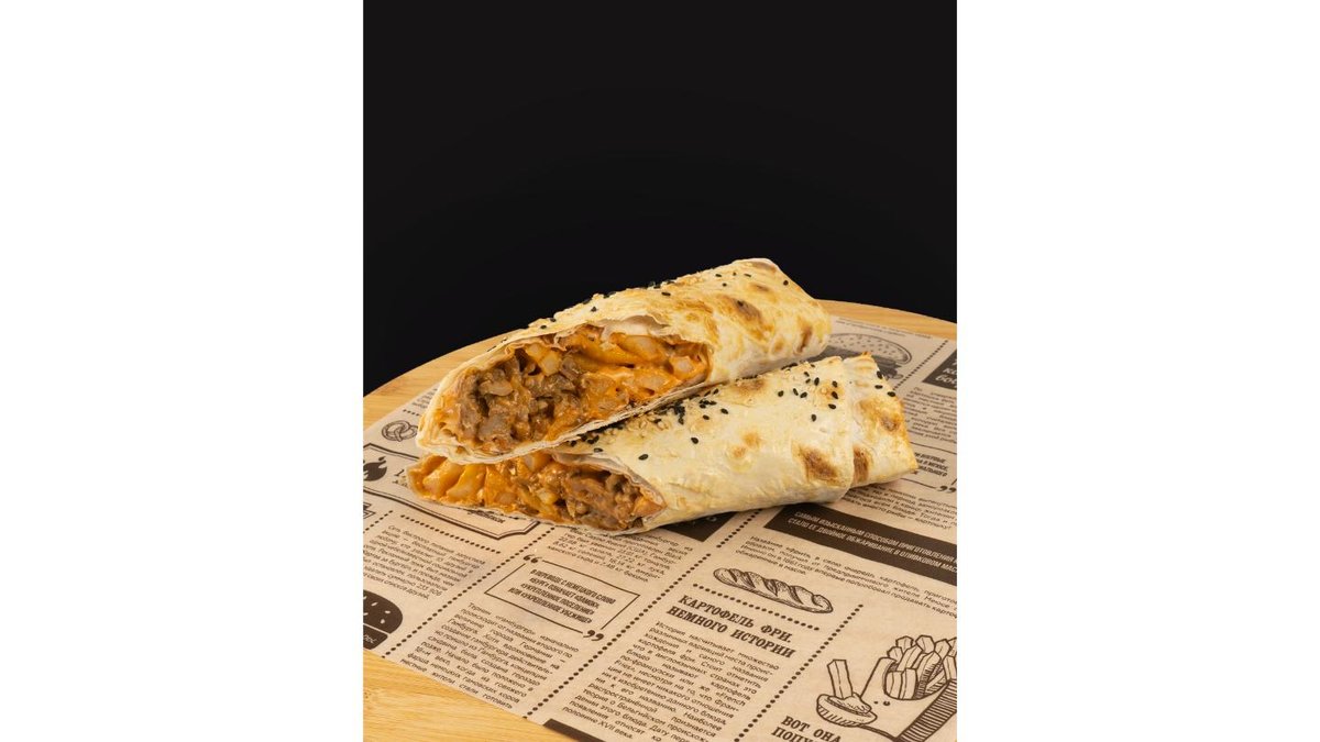 Лаваш, картошка фри(90г), запеченное мясо говяжье(200г), свежие огурцы, фирменный соус.