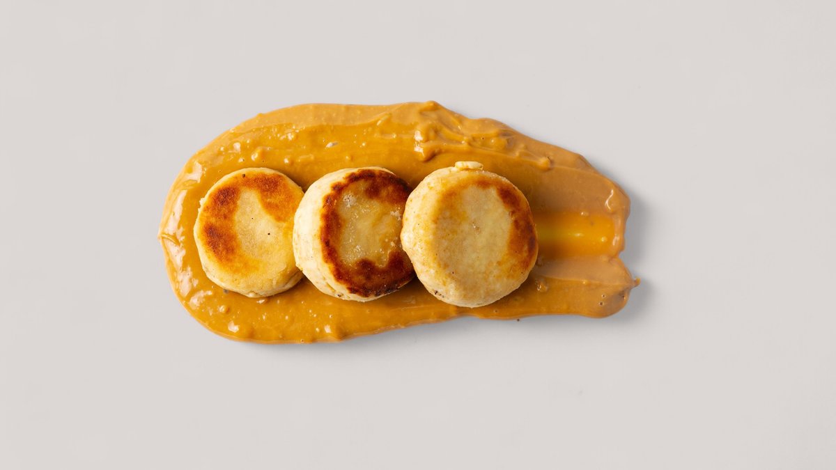 Карамелизированный, слегка с обожженной корочкой и очень нежной начинкой десерт. При подаче поливают молочным шоколадом и посыпают вафельной крошкой.