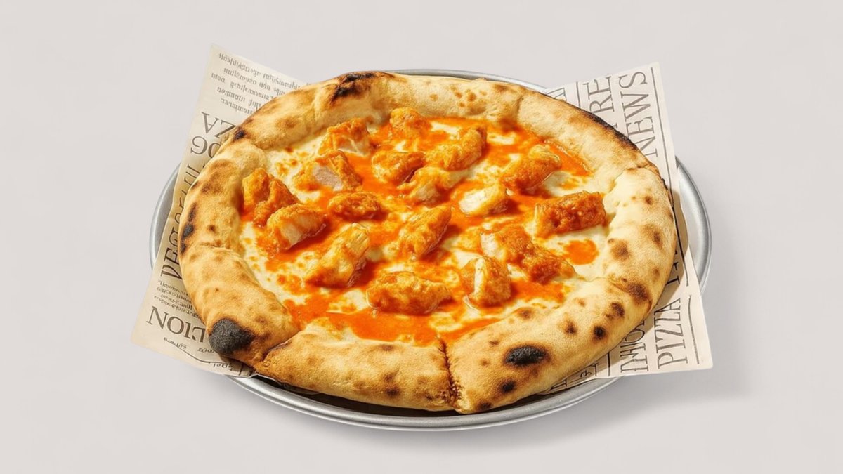 Уникальная пицца из итальянской муки, белый сливочный соус, сыр моцарелла, куриный стрипсы от como, и наш фирменный соус спайси хани