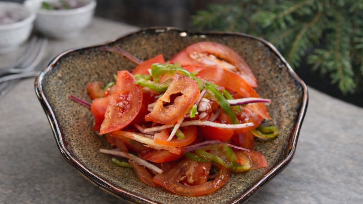 Нарезка из свежих помидоров и лука, заправленная острым перцем, с добавлением свежей зелени.