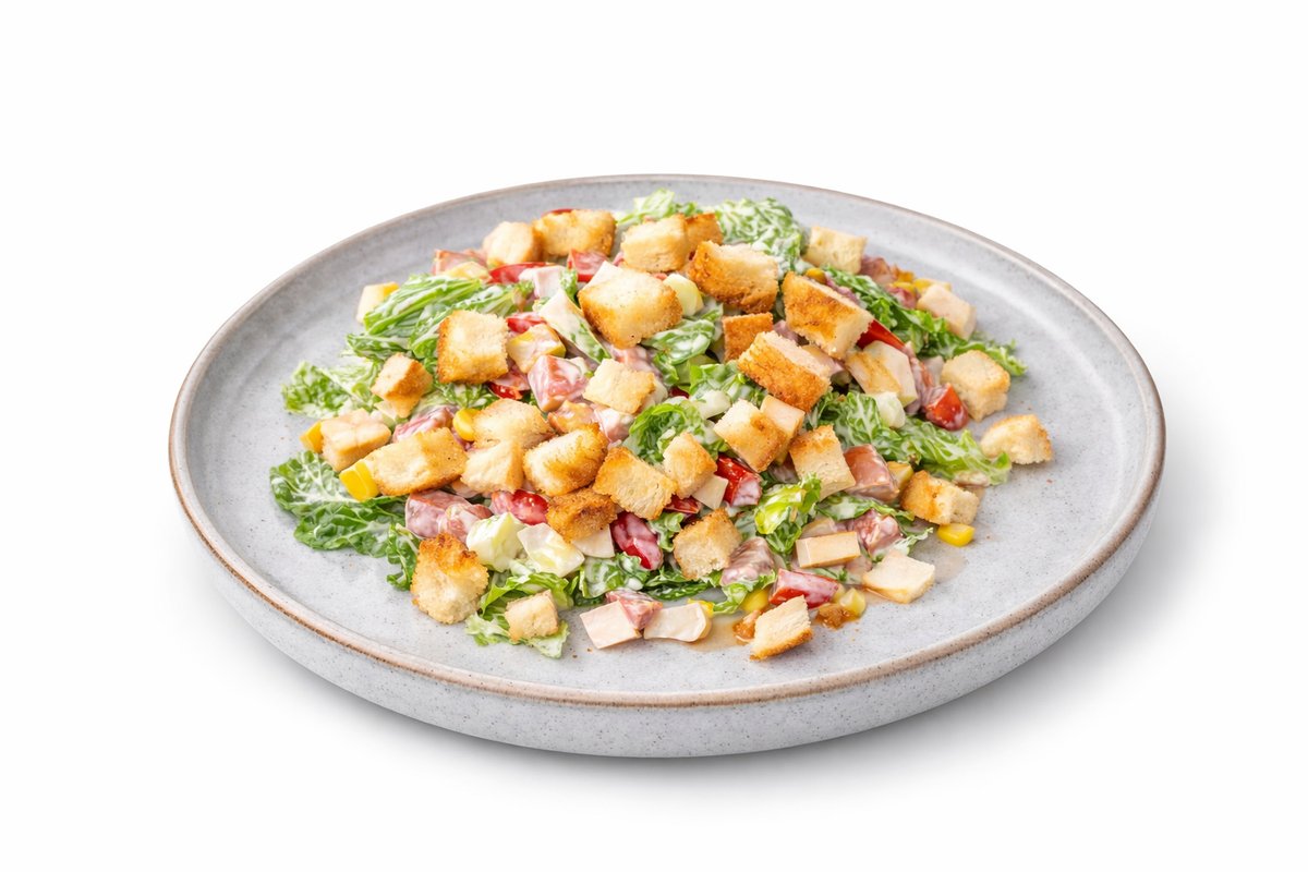 Салат из свежих помидоров, сыра моцарелла, из копченой индейки и крутонов. Заправленный майонезом