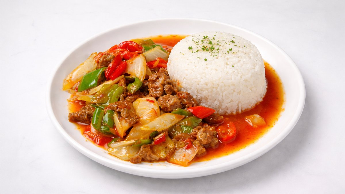 Обжаренная говядина с луком и рисом