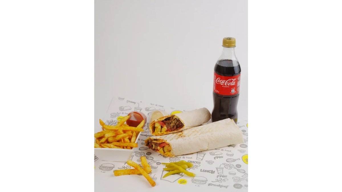 Лаваш, говядина, фри, помидоры, соленые огурцы, соус