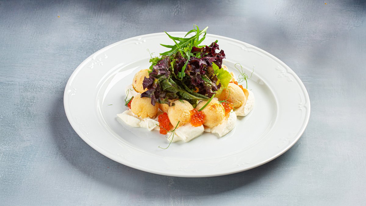 Сырники с золотистой корочкой, подаются с воздушной сметаной и красной икрой