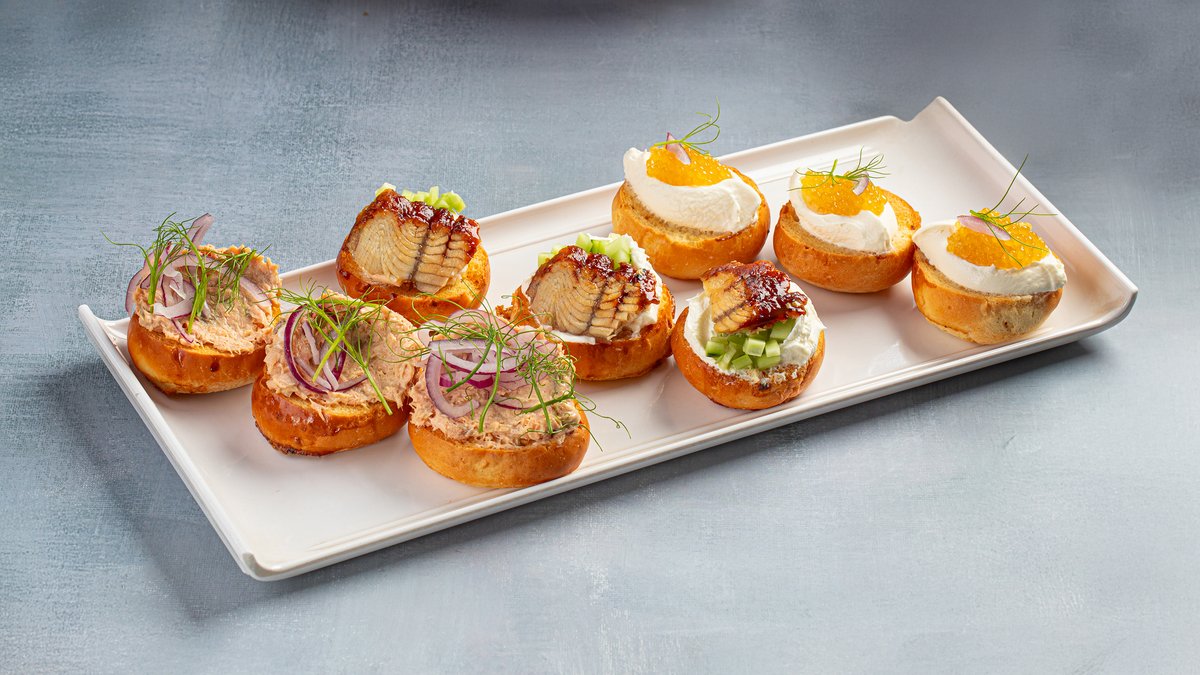 -подкопчённая сметана и щучья икра -угорь с сыром салакис и свежий огурец -рейет из форели с маринованным луком