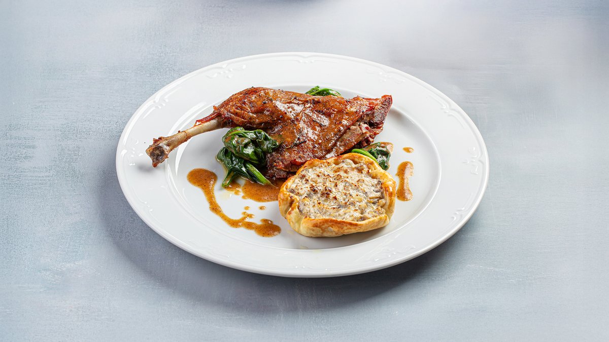 Утиная ножка под вишневым соусом с грибным пирогом