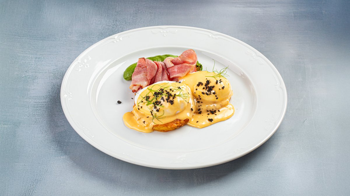 Картофельные драники с пастрами из говядины и яйцом бенедикт под соусом голландез