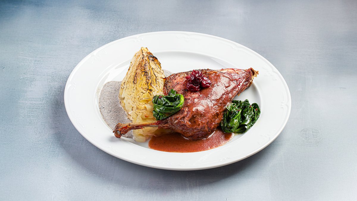 Утиная ножка под вишневым соусом с капустой