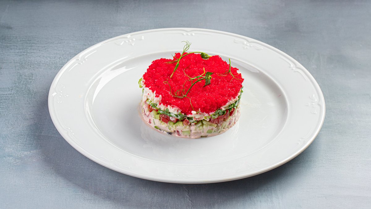 Знаменитый салат из слабосоленого филе отборной сельди, нежного отварного картофеля, куриных яиц и моркови