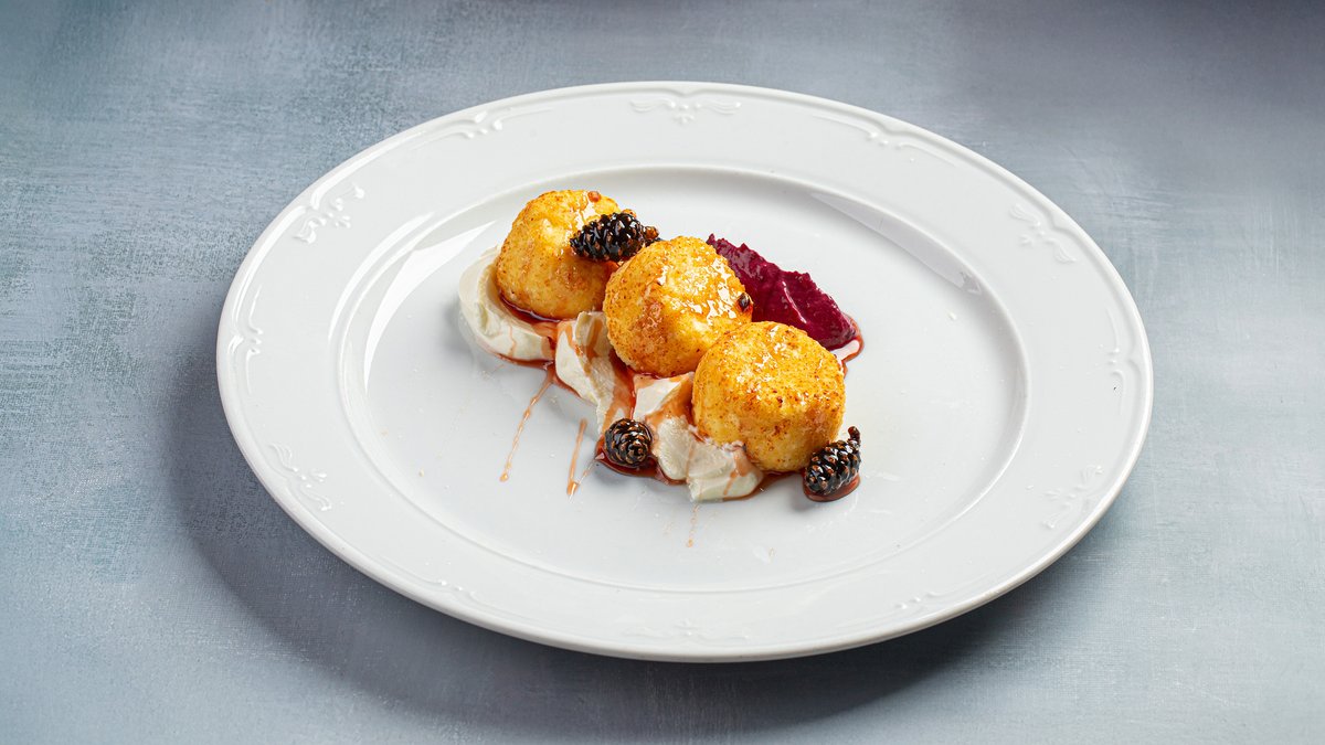 Сырники с ягодным муссом и вареньем из сосновых шишек