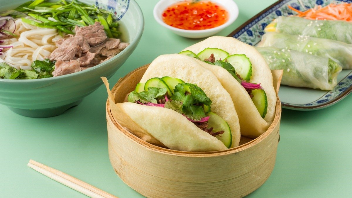 две воздушные паровые булочки с начинкой на. выбор (Томленная говядина или хрустящая курочка)