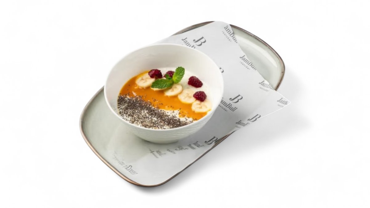Каша с манговым пюре, сезонными ягодами и семенами чиа