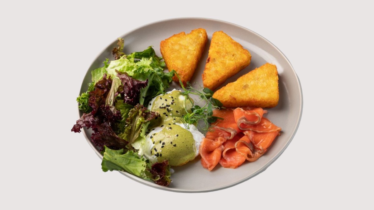 Три хашбрауна,микс салата, яйца пашот, соус айоли, топпинг на выбор