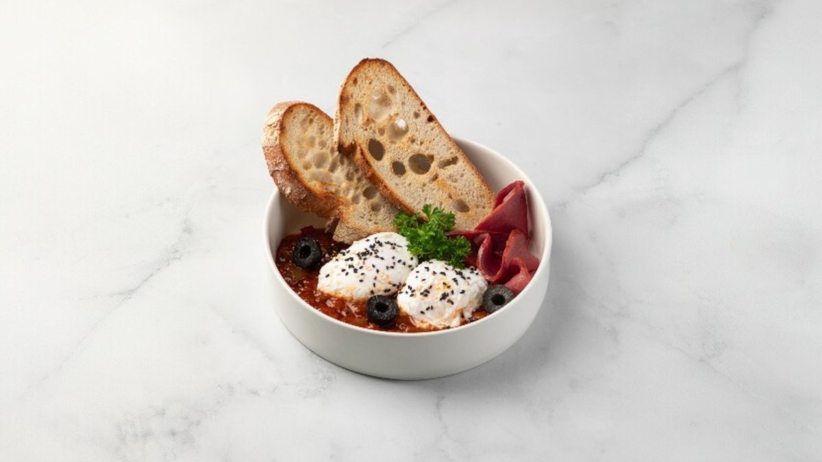 яйца, соус с томатами, репчатым луком и болгарским перцем, ветчина копченая, фермерский хлеб, маслины, зелень, кунжут