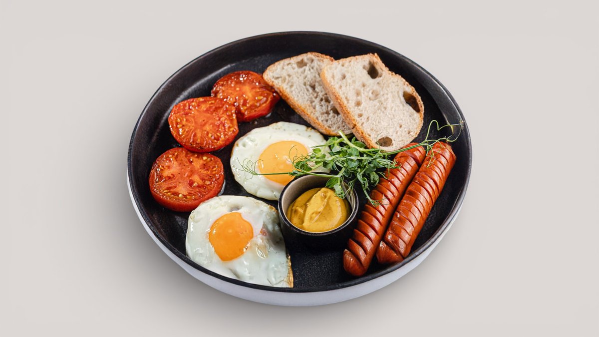 глазунья, мини колбаски говядина (6шт) помидоры горчица хлеб фермерский