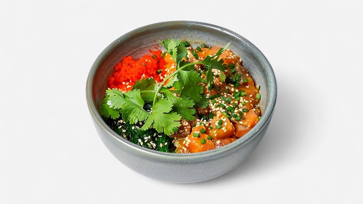 лосось с соусом из манго\рис паби со спайси соусом\салат чука\икра тобико