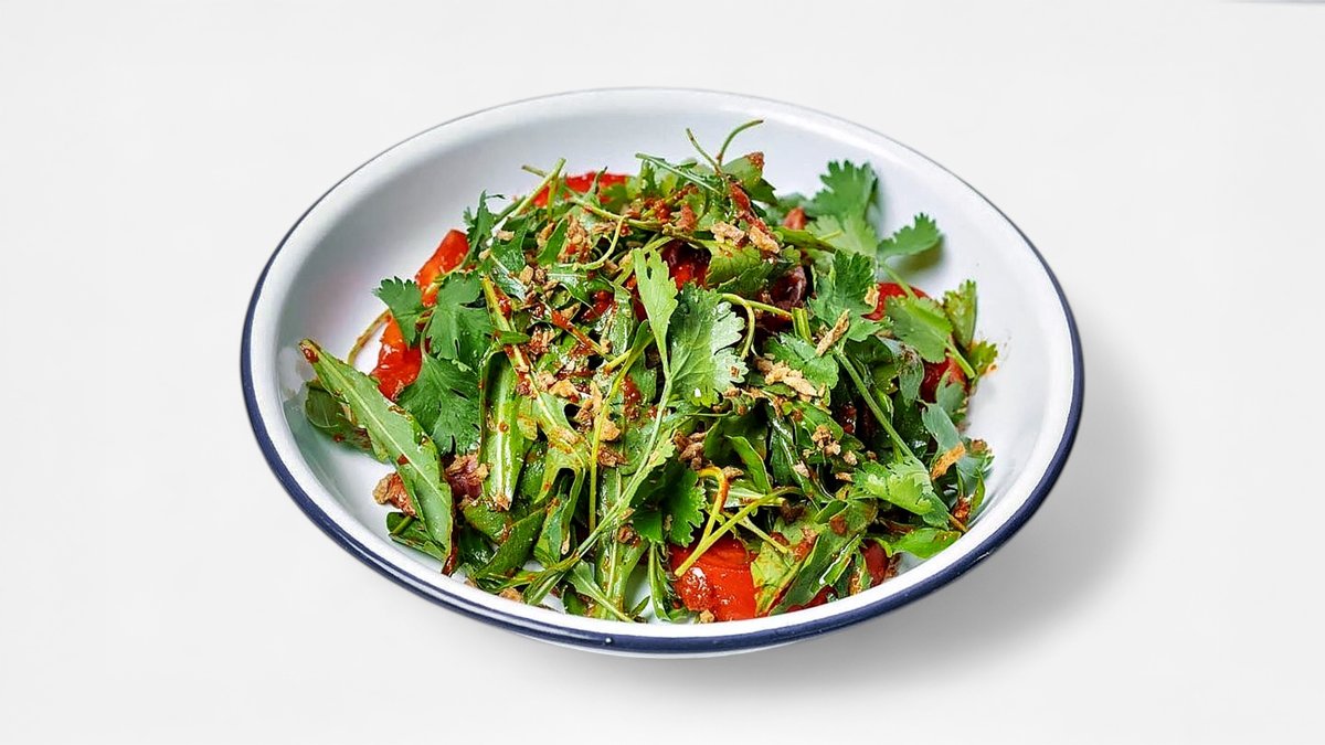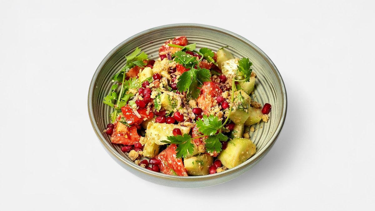 помидоры\огурцы\красный лук\ореховый соус\гранат