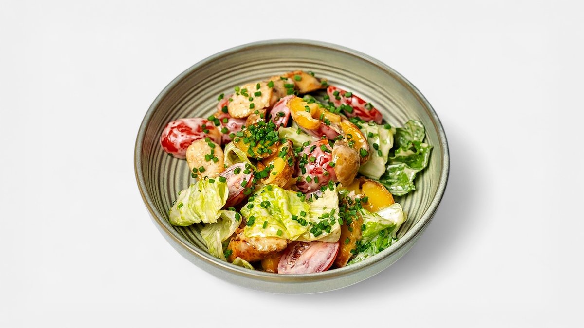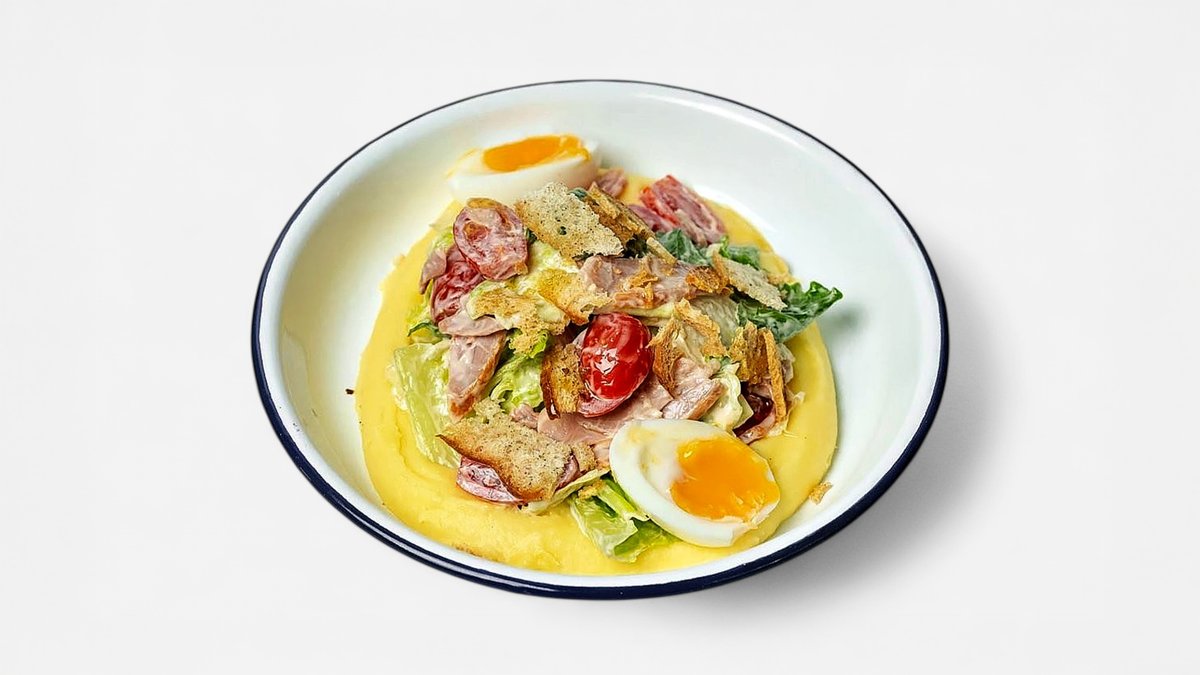 копченый цыпленок\чесночный айоли\листья салата\яйцо\гренки\картофельный крем