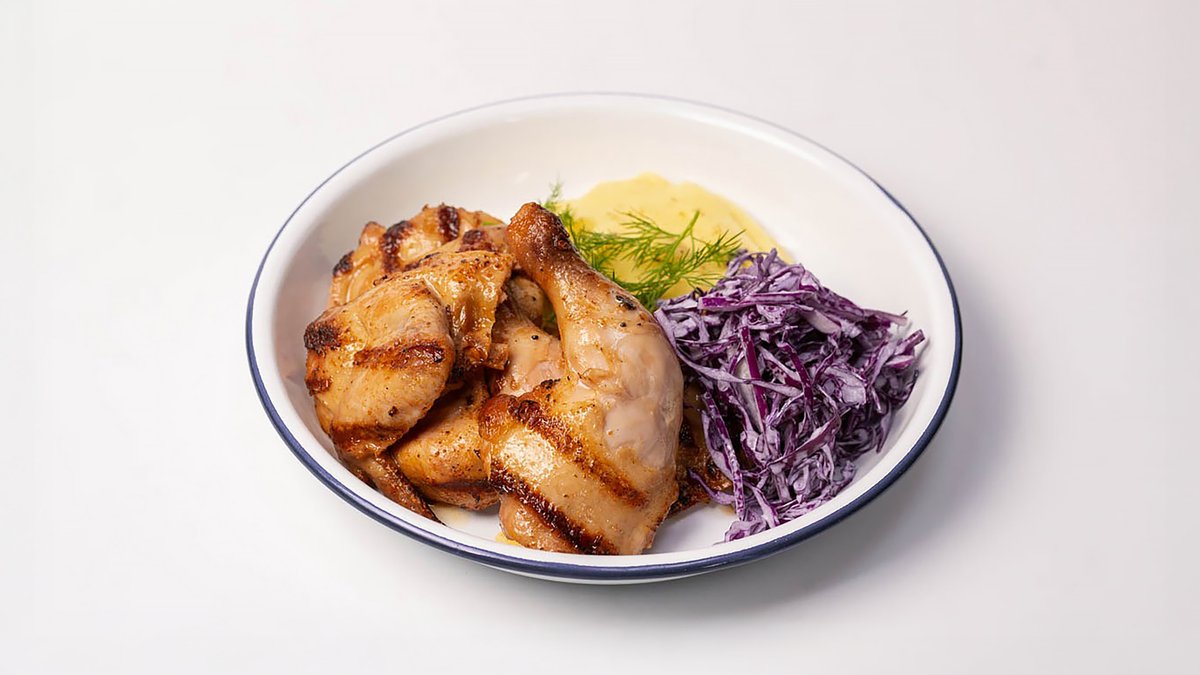 цыпленок жареный\картофельный крем\салат из капусты\соус лазджан