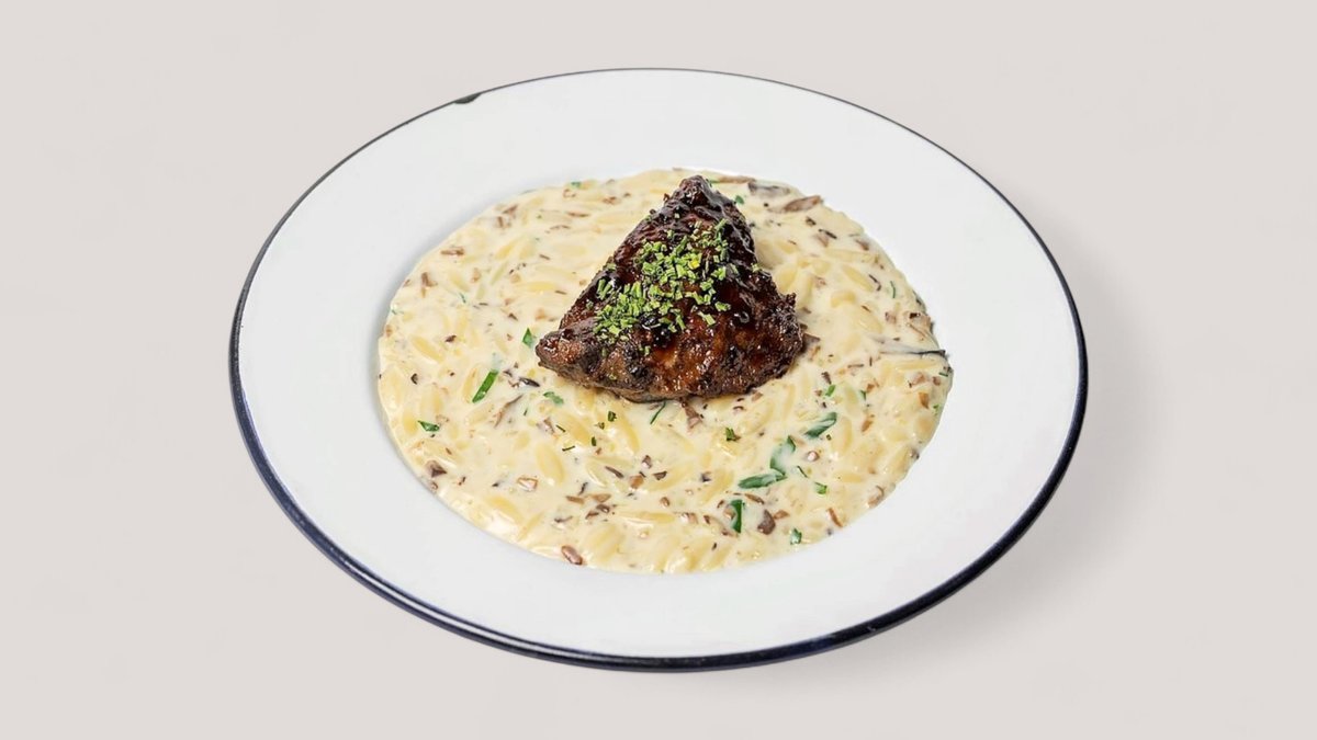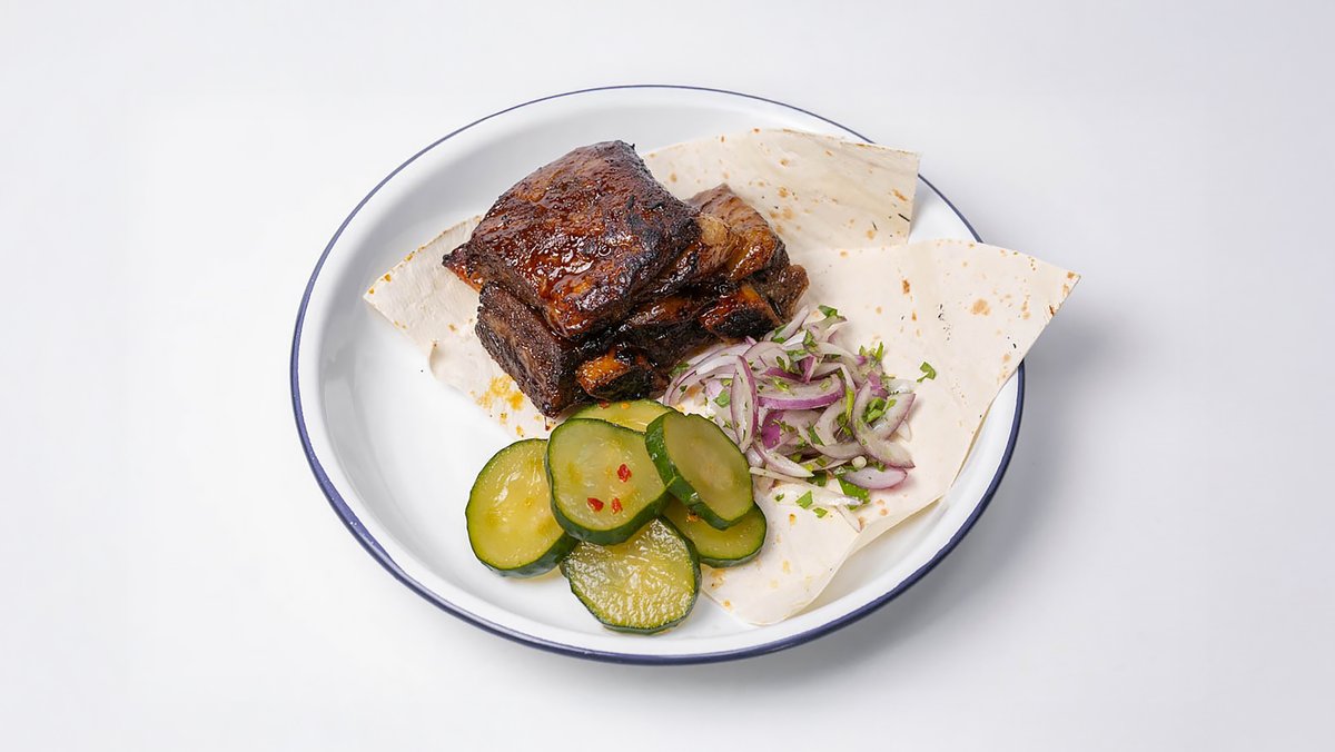 томленая мякоть ребра\маринованные огурцы\луковый салат\пита