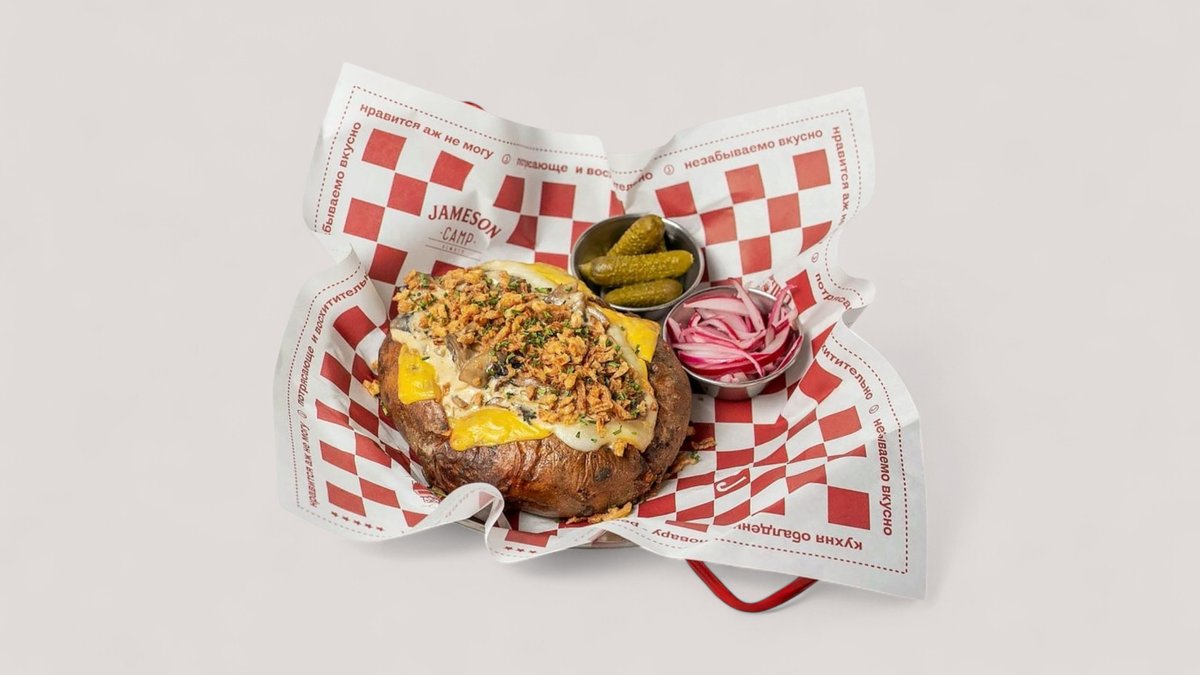 печеный картофель\жареный говяжий бекон\сыр чеддер\сыр моцарелла\грибной жюльен