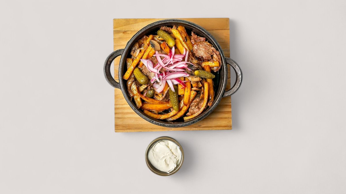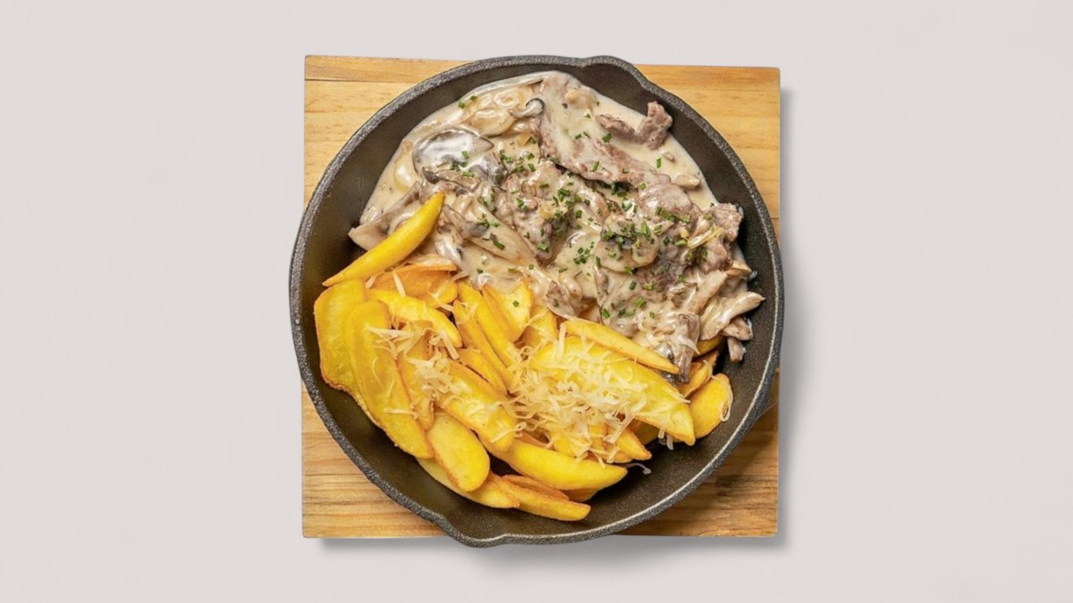 говяжья вырезка\грибы\домашняя сметана\картофель фри