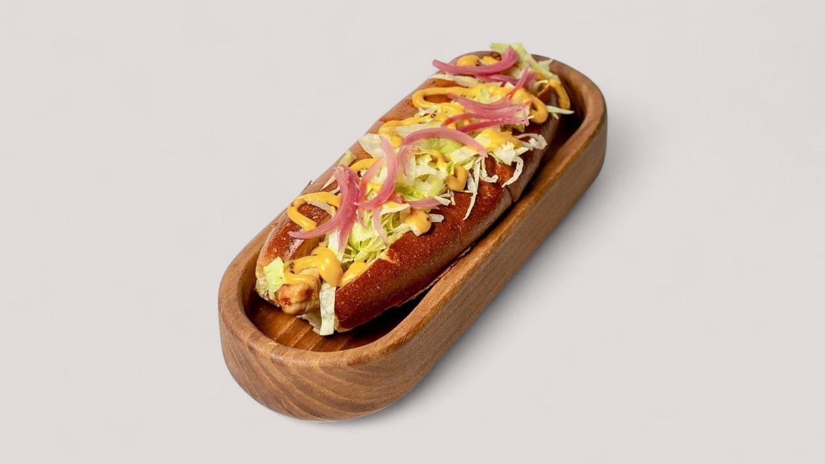 куриная колбаска\бриошь\соус спайси\сладкая горчица