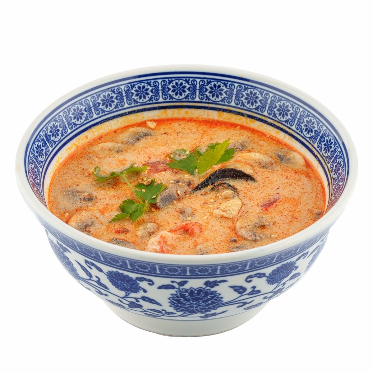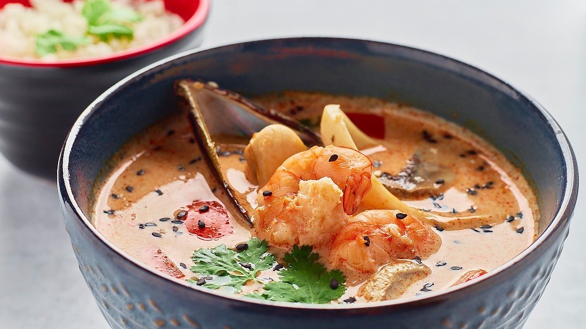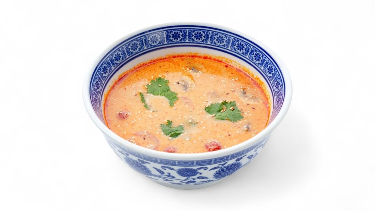 Пряный тайский суп на ароматном бульоне с курицей, шампиньонами, черри и рисом.