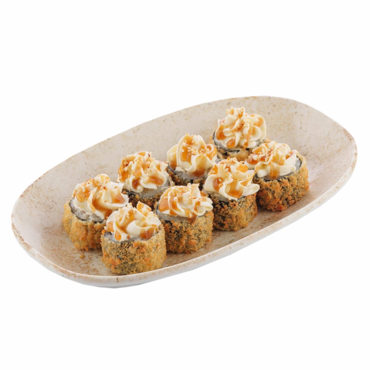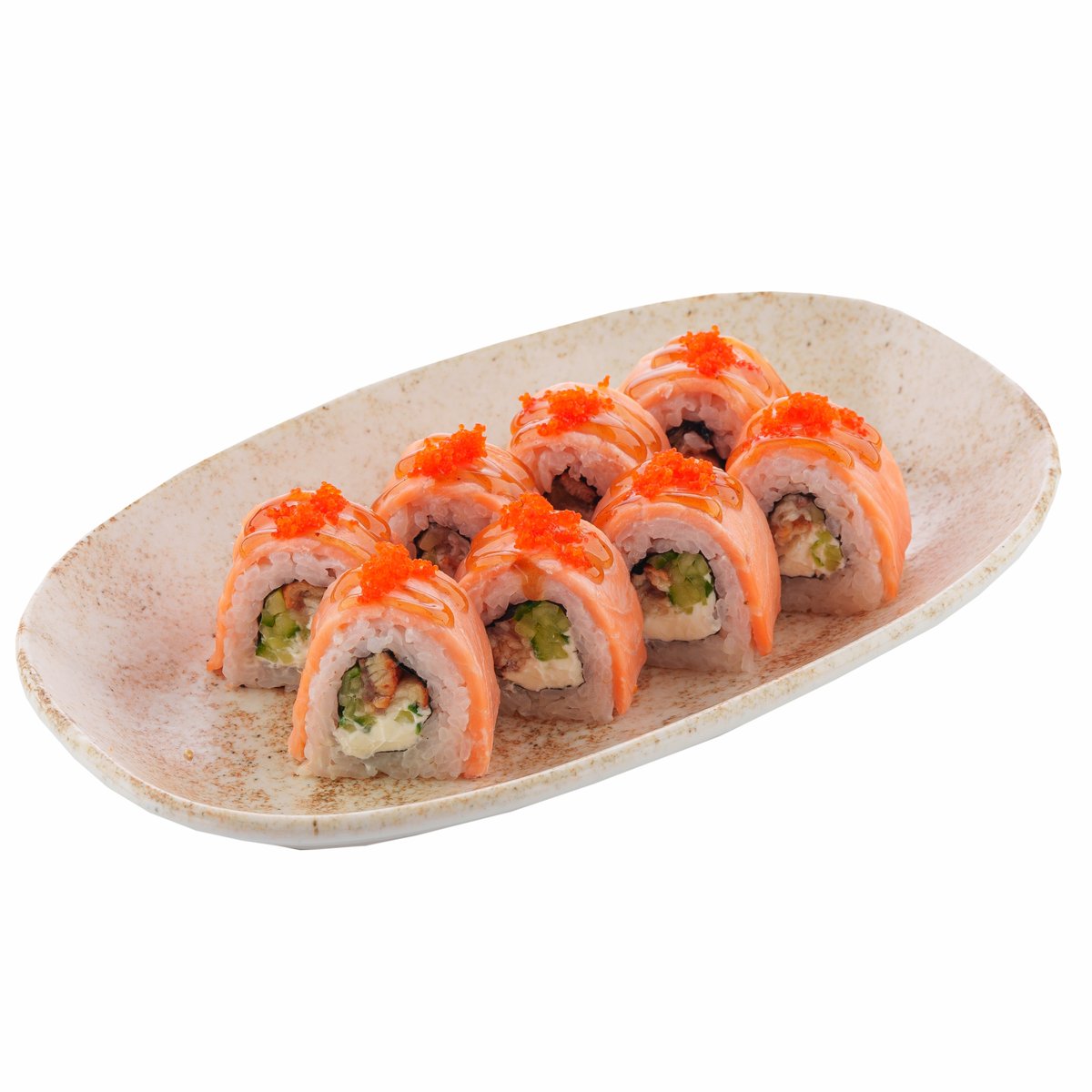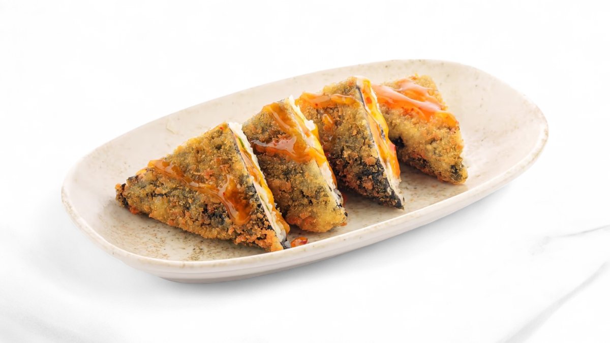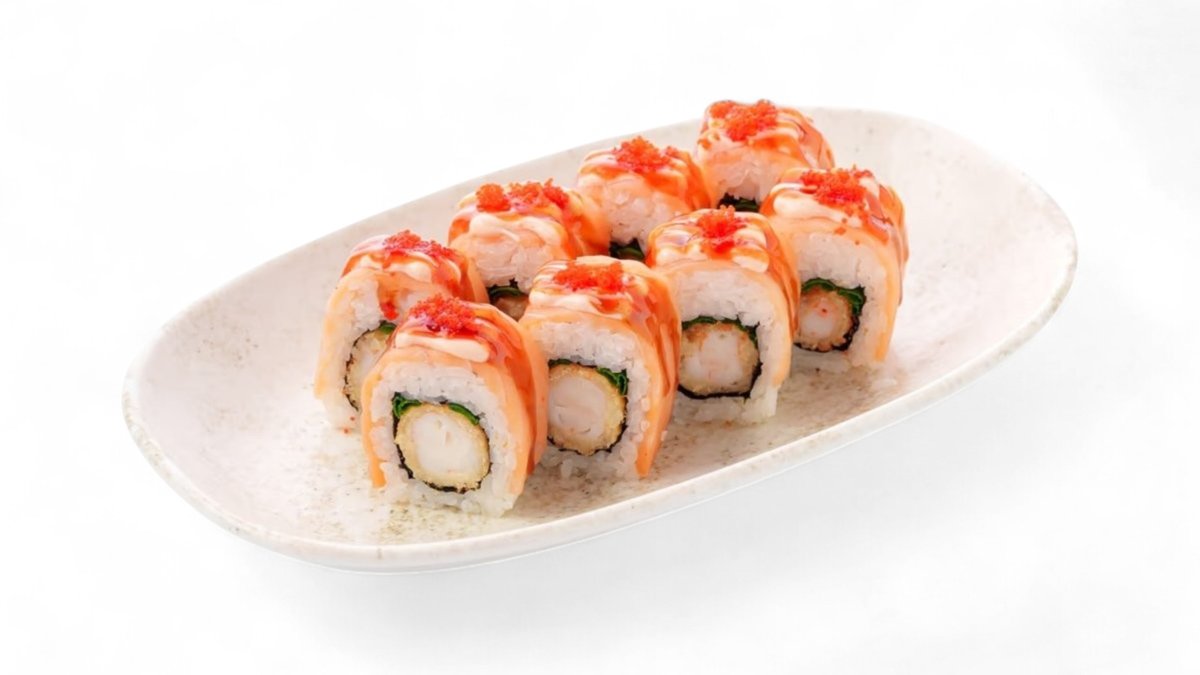 Хрустящий ролл с креветкой и лососем панко, с пикантными соусами терияки и шрирача, украшенный икрой тобико