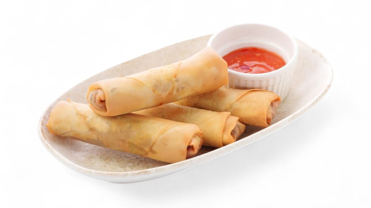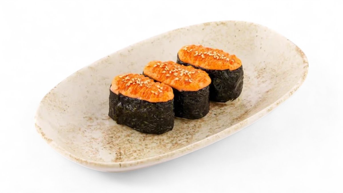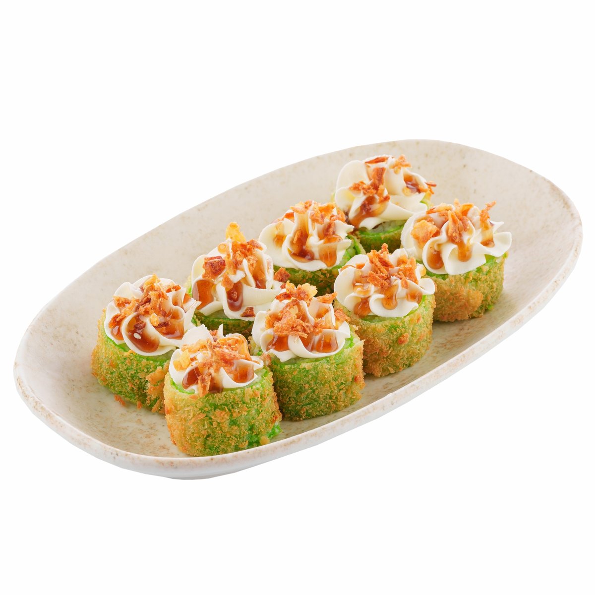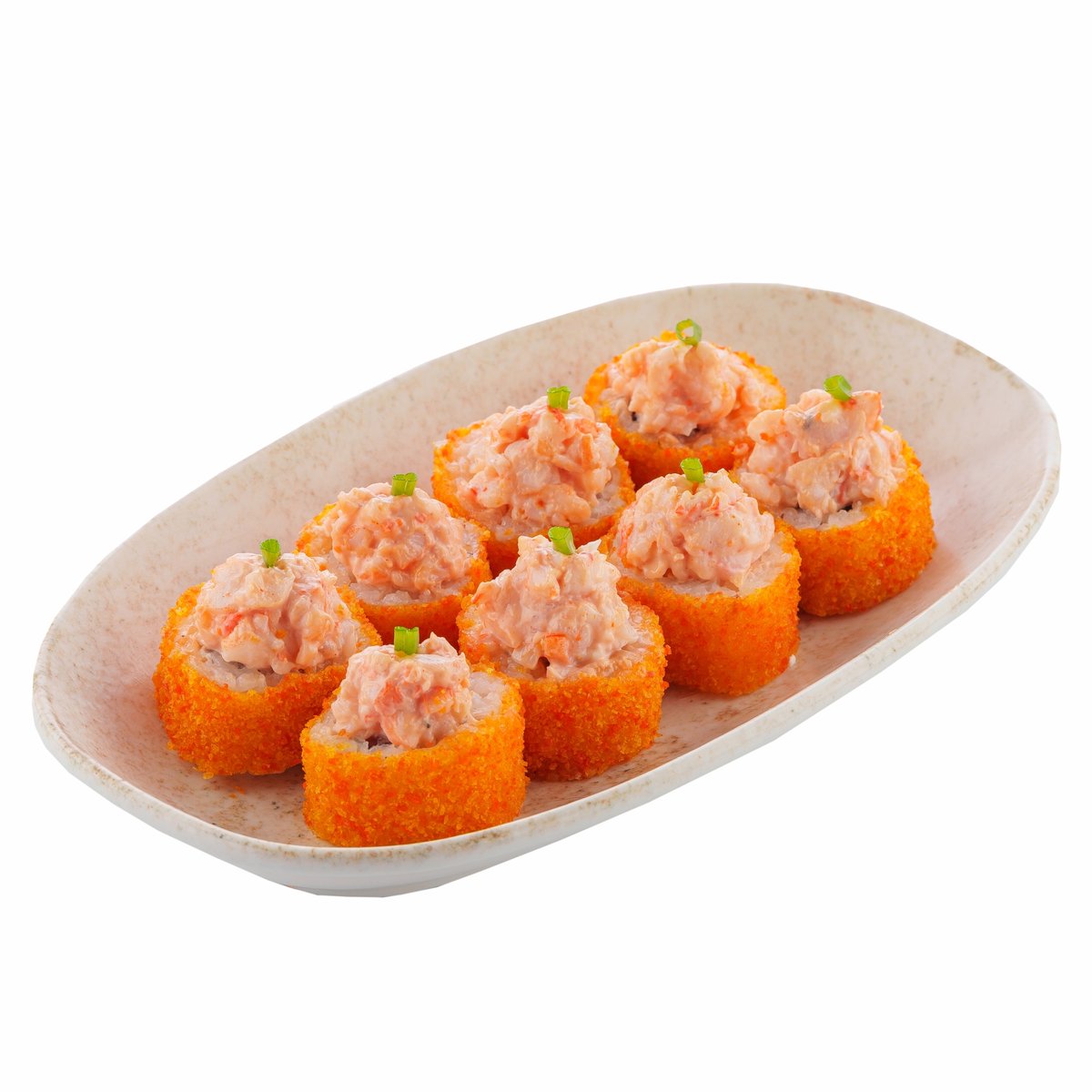 Хрустящий ролл с креветкой и лососем панко, с пикантными соусами терияки и шрирача, украшенный икрой тобико