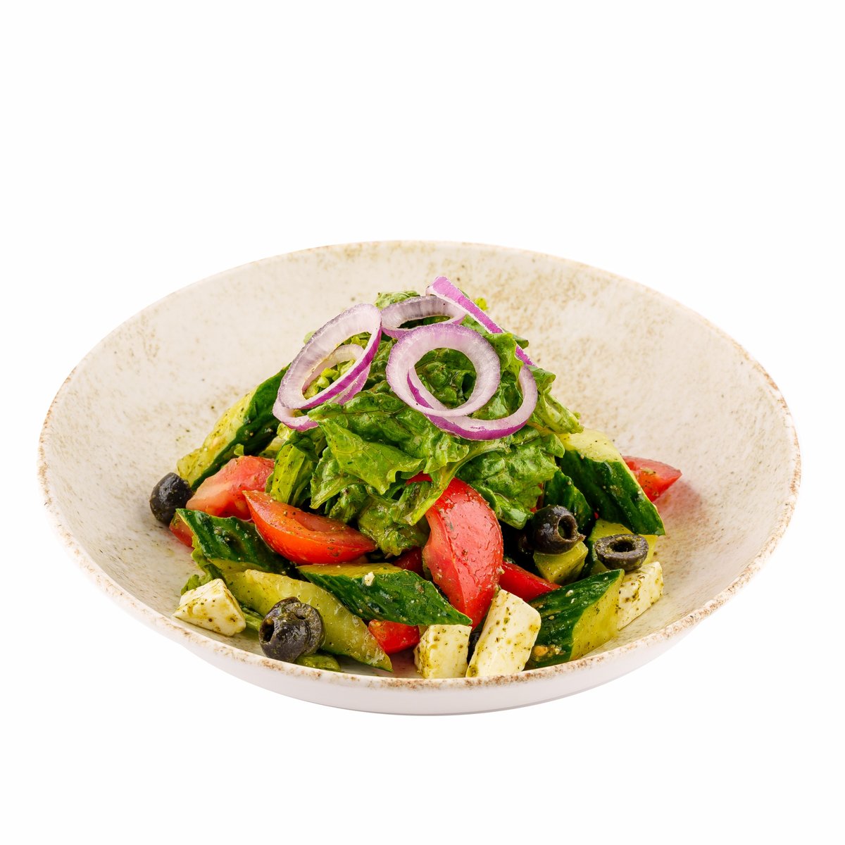 сыр фетакса, помидоры ,листья салата, огурцы , маслины , болгарский перец.