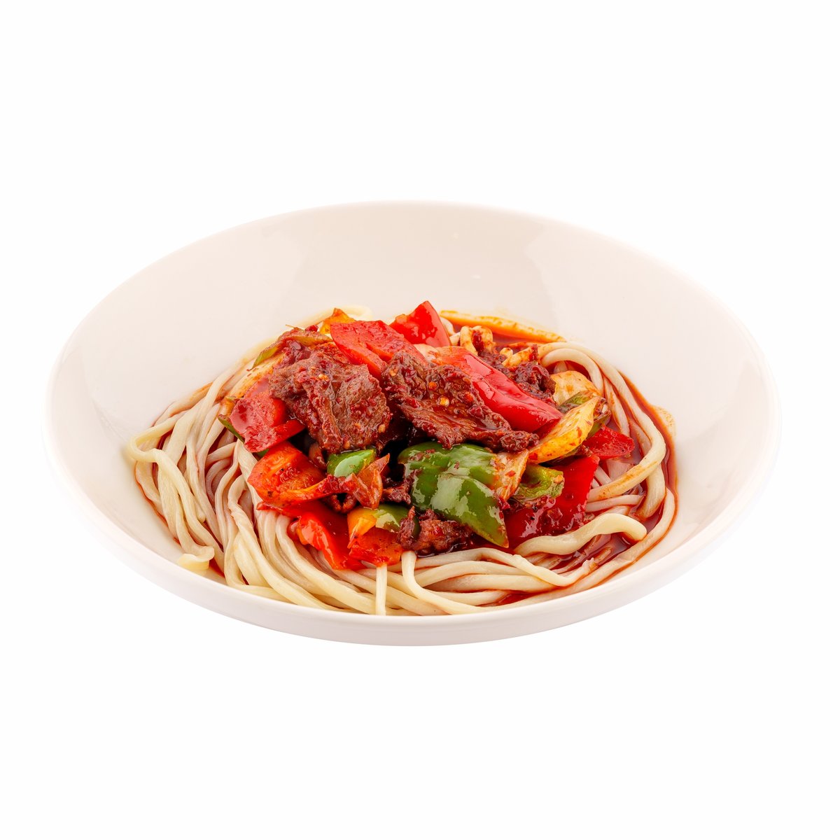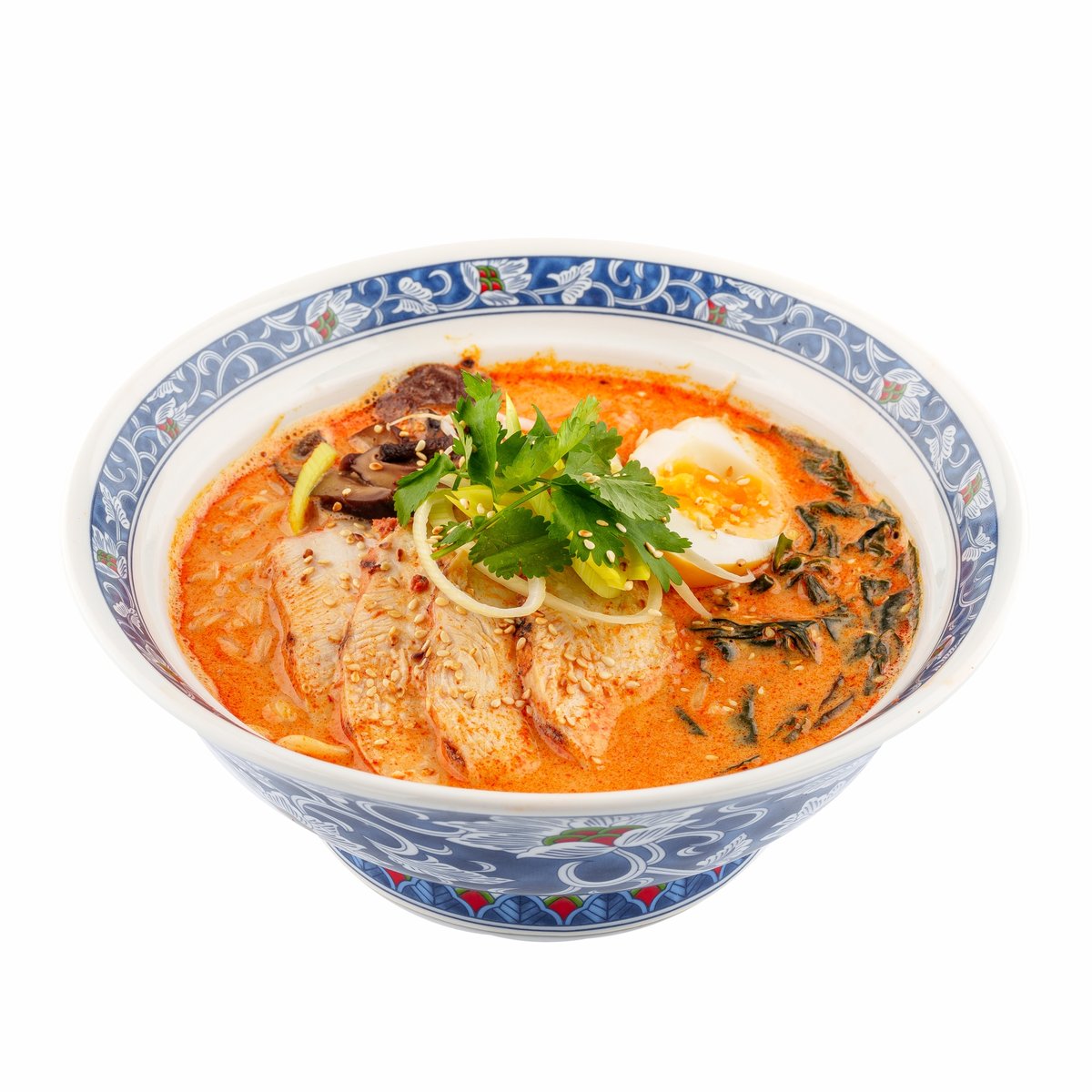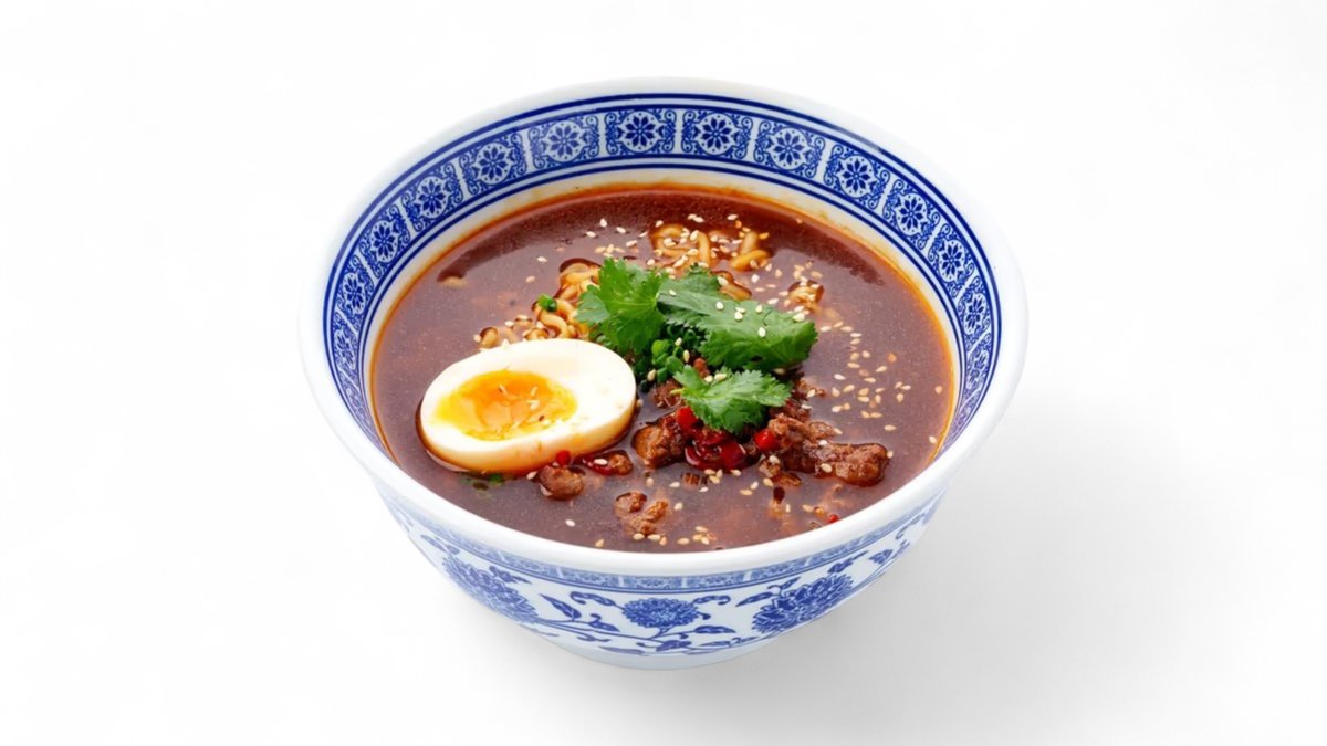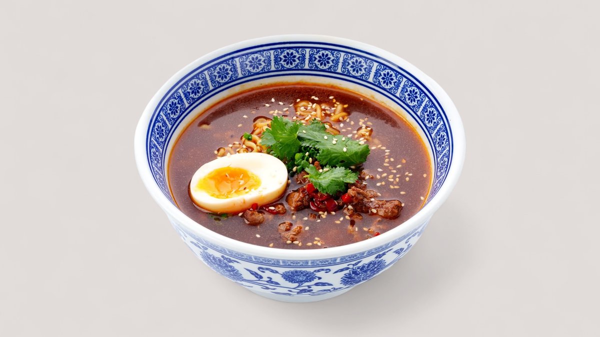 Рамен с обжаренным говяжьим фаршем на наваристом курином бульоне, пряный и насыщенный, с лапшой рамен, овощами и пикантными специями.