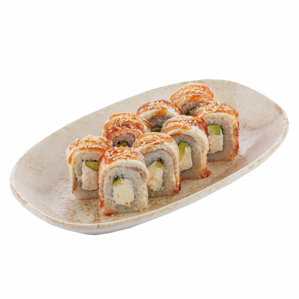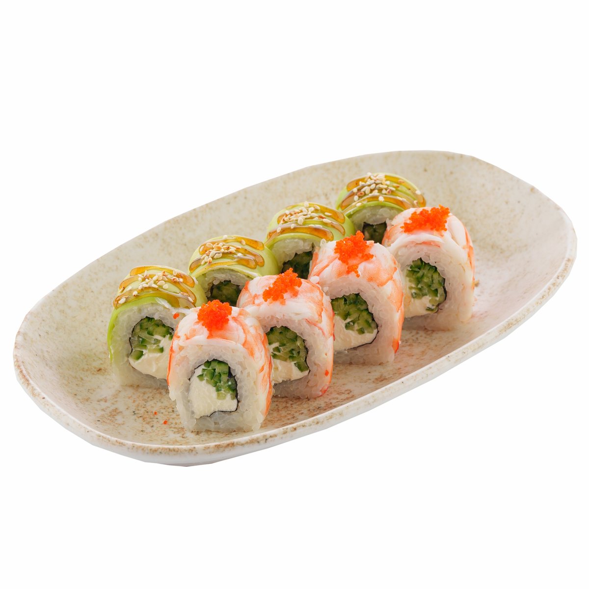 запеченный ролл с креветкой,огурцы,сливочный сыр,майонез,тобико соус,унаги соус