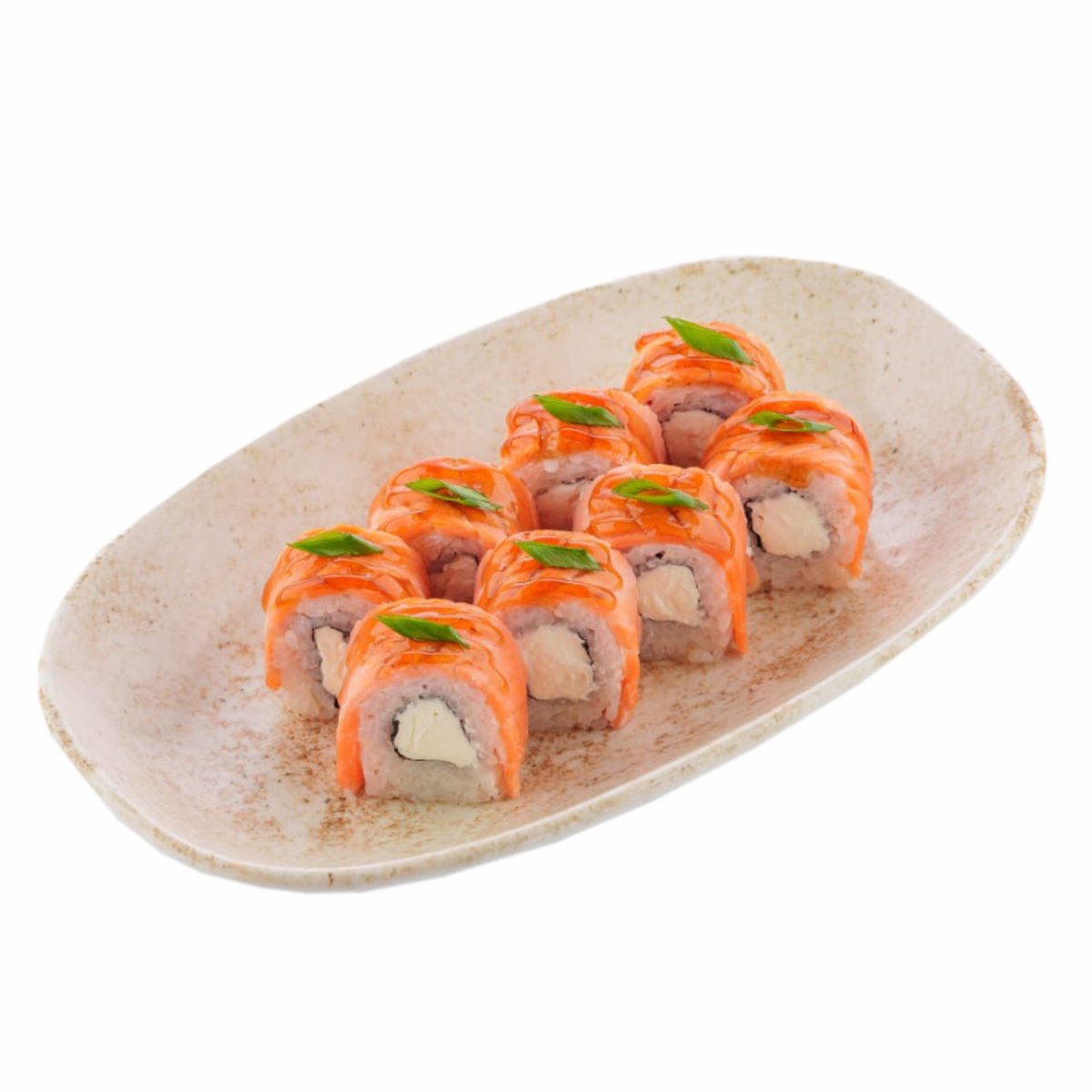 жаренный лосоь с угрем,сливочным сыром и жаренным луком,соус терияки