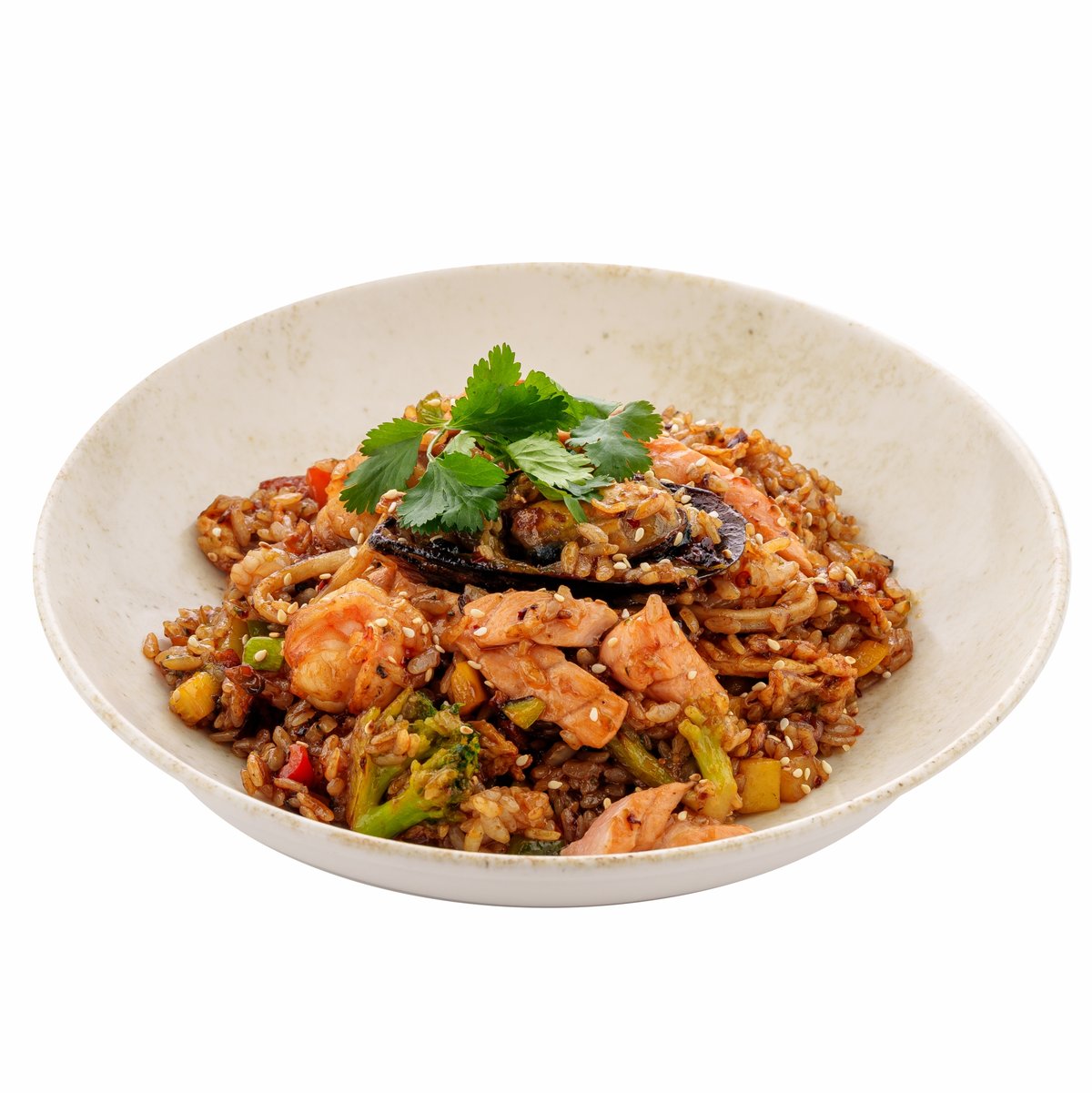 рис,болгарский перец,лук репчатый,брокколи,ростки сои,яйцо,соевый соус,рыбный соус,терияки соус,черные бобы,мидии,кальмар,креветки