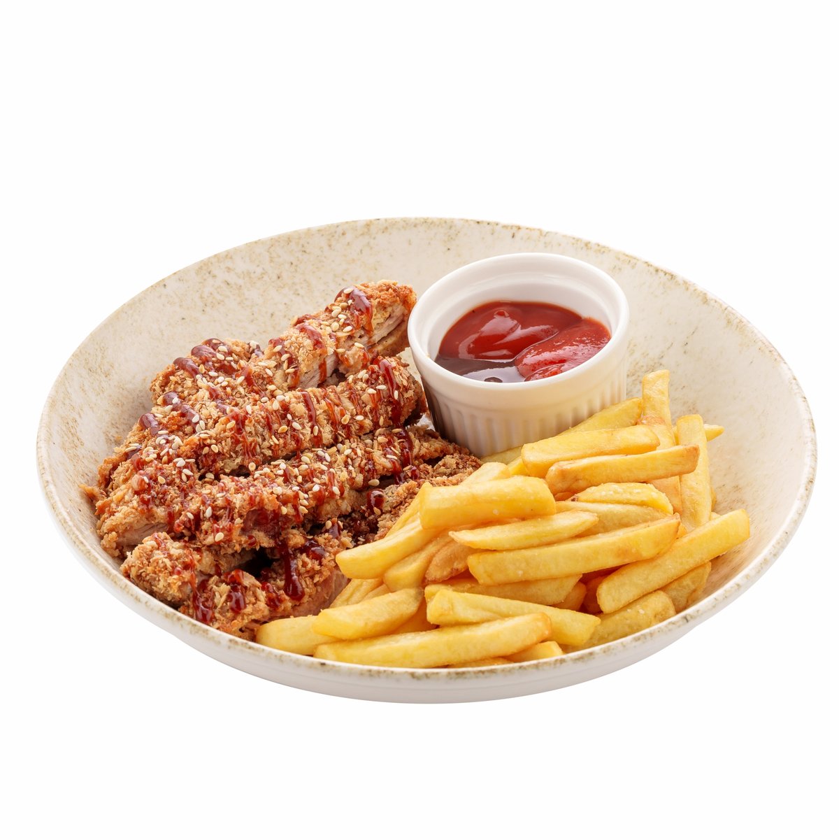 Стейк Нью-Орк- сочный стейк, идеально обжаренный до желаемой степени, с гарниром из хрустящего картофеля фри, подается с ароматными соусами BBQ и белым соусом для насыщенного вкуса.