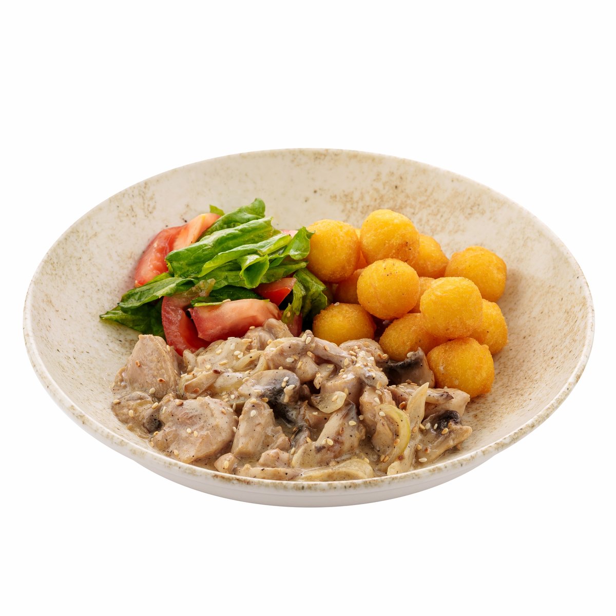 обжаренные кусочки куриного филе с лучком и шампиньонами в сливочном соусе с шариками из картофельного пюре в хрустящей панировке