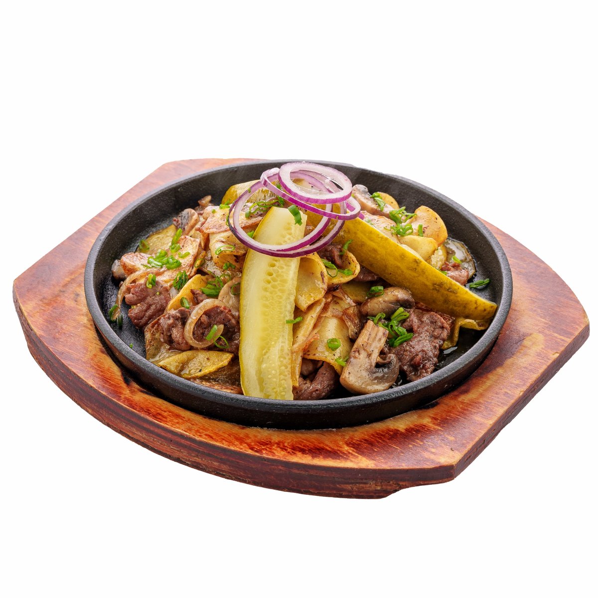 Обжаренная с чесночком до хрустящей румяной корочки картошка с нежной телятиной и шампиньонами на жаровне, посыпанная зеленым луком