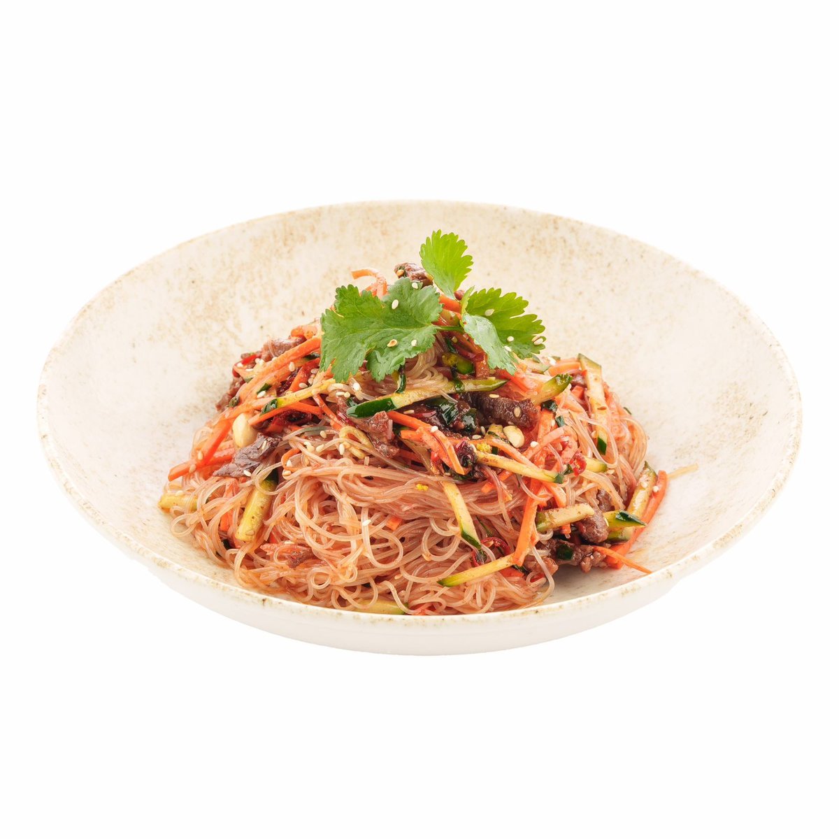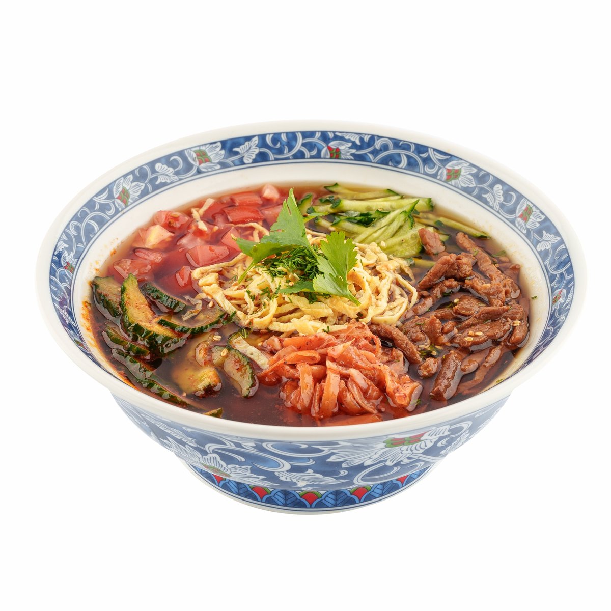 тонкая лапша, огурцы, помидоры, говядина, бульон, капуста, блины, укроп, кунжут.