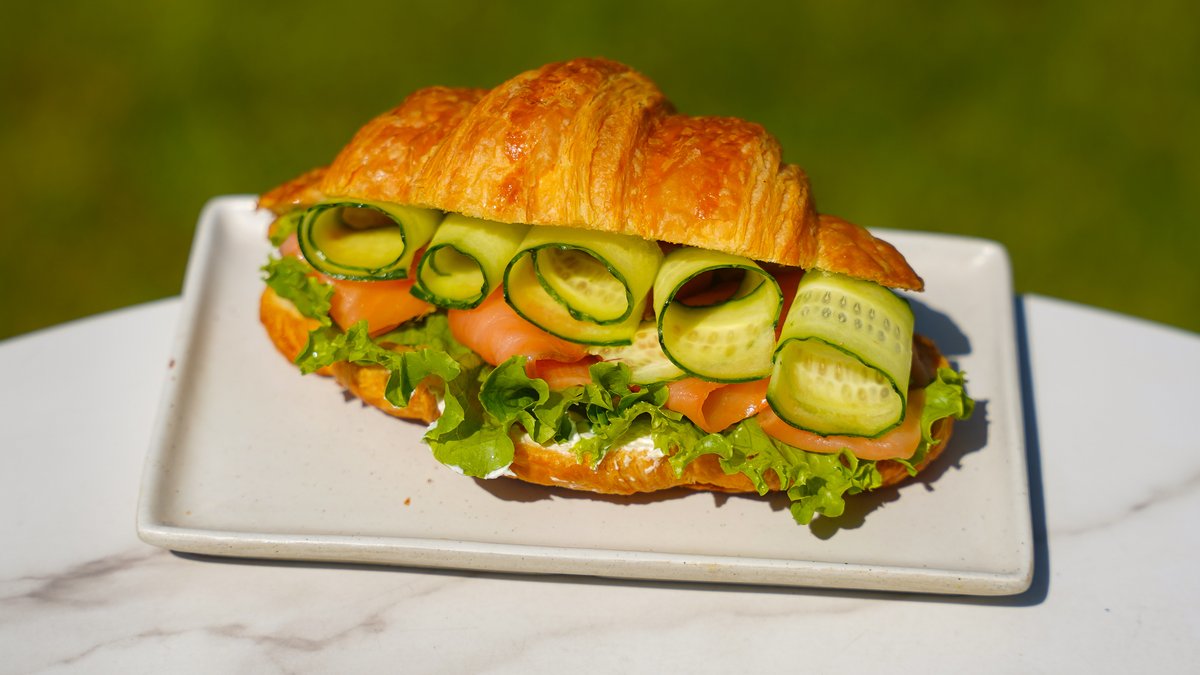 Хрустящий круассан с курицей, помидорами и огурцами под авторским соусом и голладским сыром.