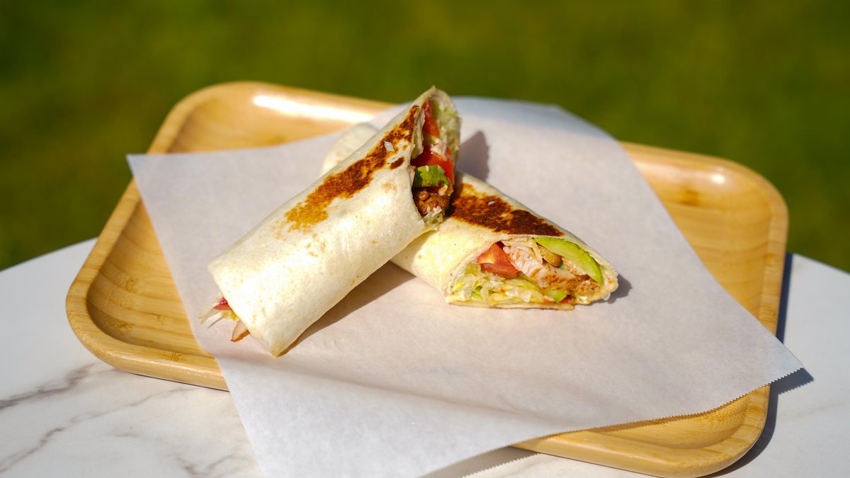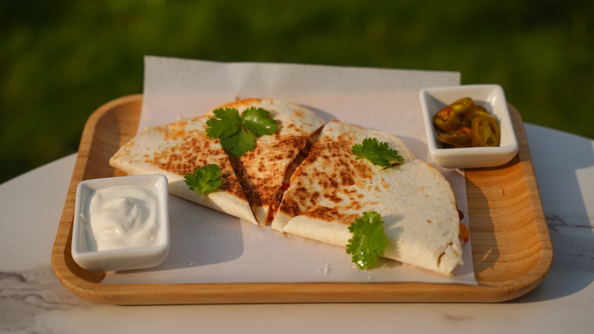 Тортилья, халапеньо, авторские соуса, сыр моцарелла, овощи.