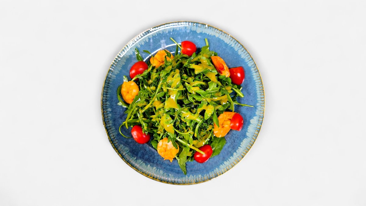 Руккола, креветки,горчичный соус, томаты