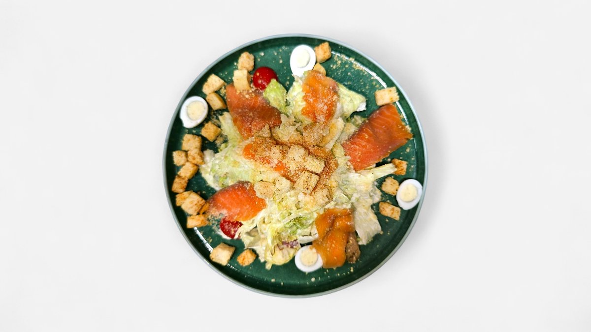 Яйцо куриное, картофель, морковь, огурцы солёные, семга холодного копчения, майонез, горошек