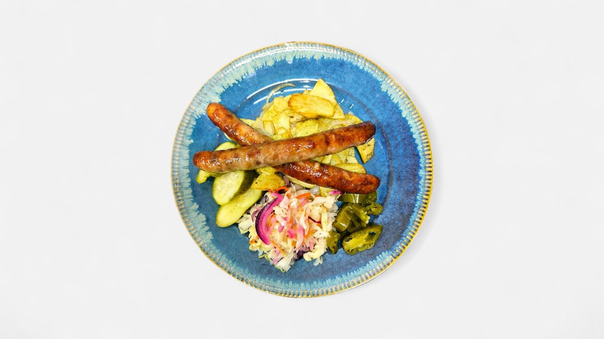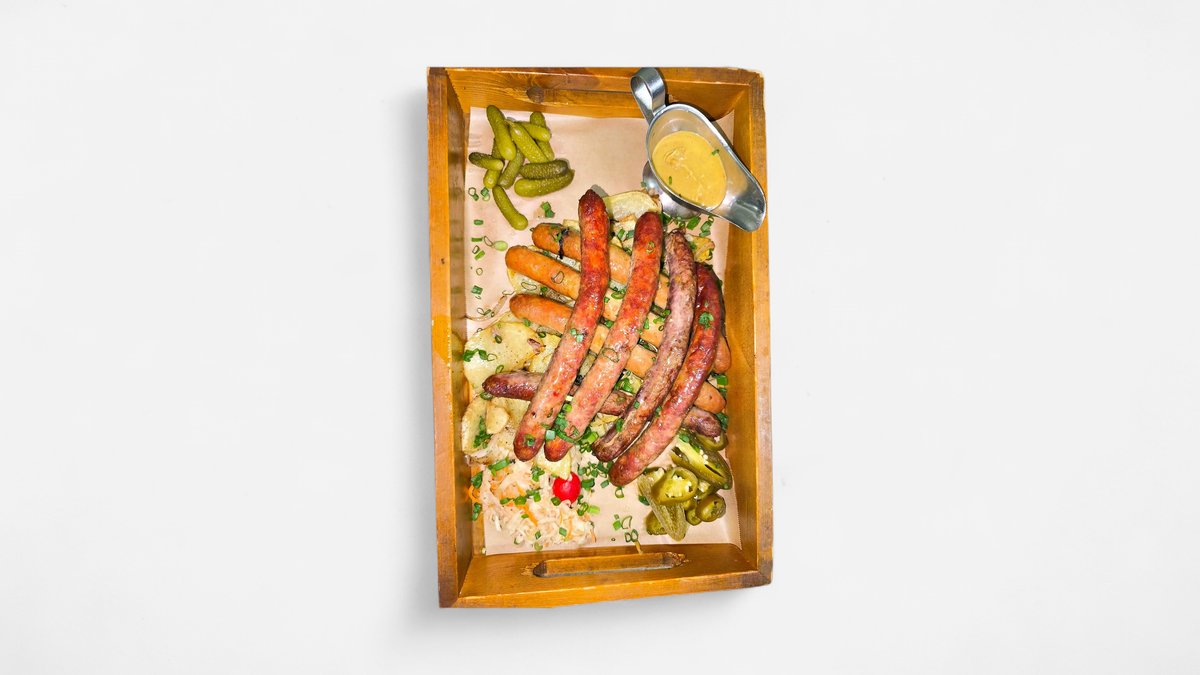 Сельдь, картофельные дольки, капуста квашеная, лук, корнишоны