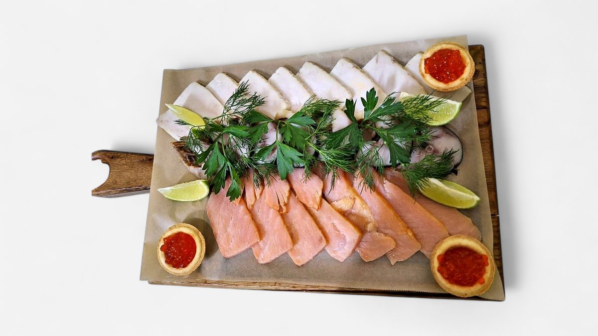 Балык холодного копчения, семга холодного копчения, икра красная, горбуша, маслины, оливки, лимон, зелень