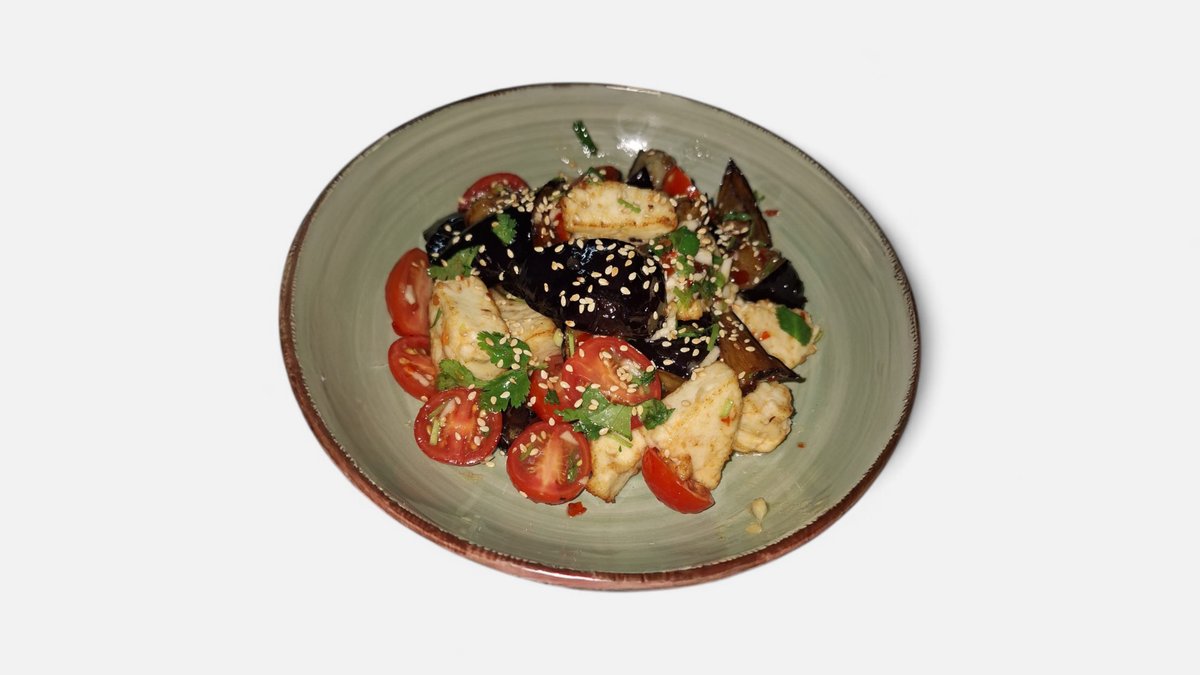 Жареная брынза, телятина, перец светофор, лук, помидоры, кинза, специи