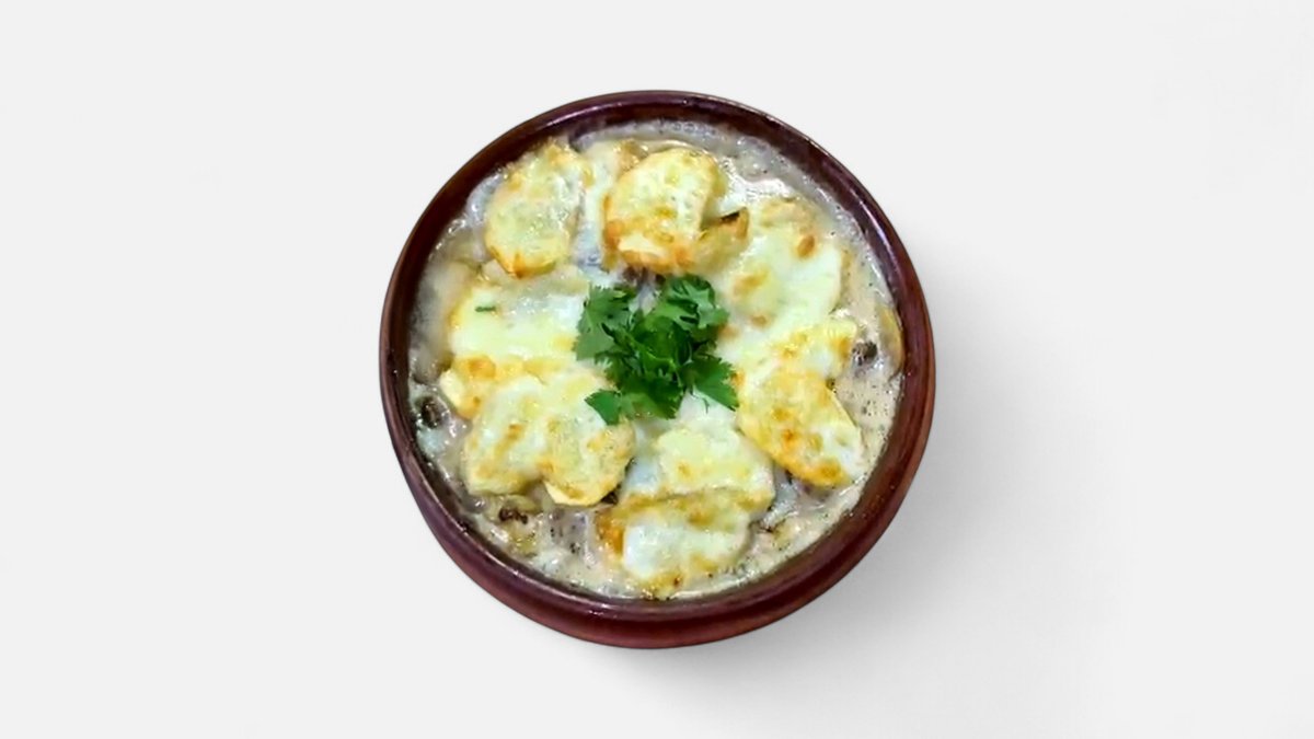 Баранина, лук, шампиньоны, картофель, сулугуни, специи